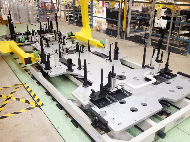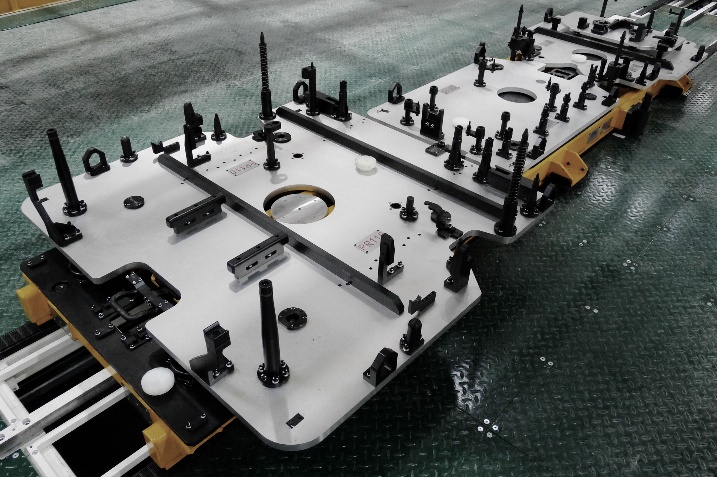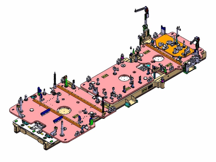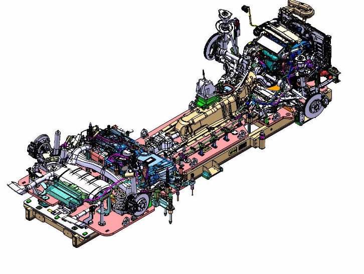 合裝托盤是在底盤裝配線至合裝線的環線中用于承載包括發動機在內的底盤各個裝配件的載具。合裝托盤由主框架和三個分裝托盤,即前托盤(含發動機托盤)、中托盤和后托盤組成。合裝托盤與底盤裝配工藝、輸送設備和合裝裝配工藝都有著緊密的關聯,因此它的設計難度和要求都很高。作為一個造價高昂的載具,設計理念優秀且制作精良的合裝托盤能夠最大程度的保證合裝的可靠性,并具有一定的裝配工藝延續性和可拓展性。