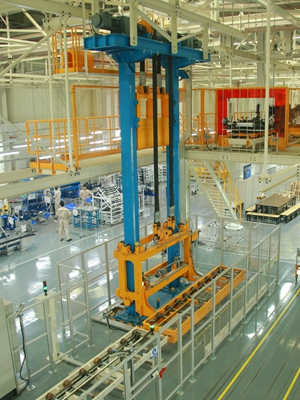 POM線(底盤分裝線)輸送板鏈、合裝線輸送系統、滿載/空載托盤空載緩存輸送線及重載升降機等;